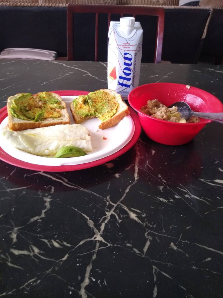 Egg white omelette, avocado toast, and some apple cinnamon oatmeal. Oh yeah, don’t forget the watermelon and lime water.