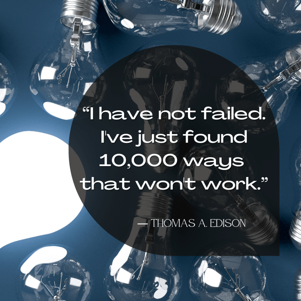 Thomas Edison isn’t known for the 10,000 ideas he had, tried and failed at. Yet we beat ourselves up for the many times we’ve failed at something. Sometimes the way we see things just needs to change so that we can move forward. What if you adopted Edison’s way of seeing things. What if those times it didn’t work was just an experiment to get you closer to what will work.